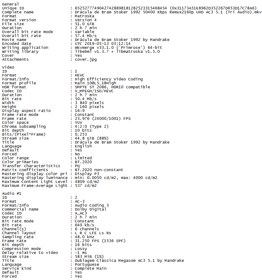 Versão BD-Remux – 3840×2160 – x265 – HEVC – 16:9 – 23.976 FPS – [email protected] – 50.400 KBPS