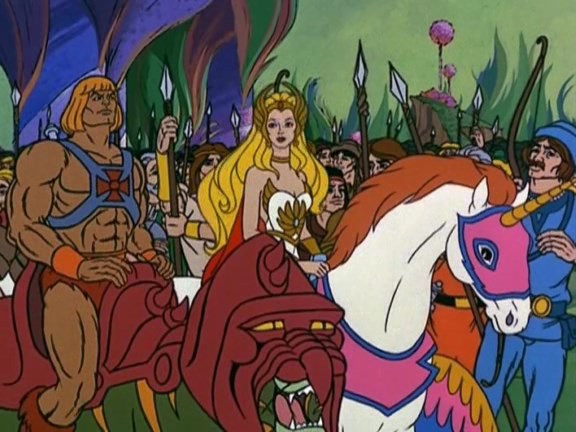 O Príncipe Adam, filho do Rei Randor e da Rainha Malena, tinha uma irmã gêmea: Adora, que havia sido raptada ainda bebê pelo vilão Hordak.Hordak, por sua vez, foi mestre do Esqueleto, maior inimigo de He-man. E resolveu fugir de Eternia quando se sentiu ameaçado por seu aprendiz, que se tornava cada vez mais poderoso. Na fuga resolve raptar um dos gêmeos.A Feiticeira, responsável pelo castelo de Grayskull, apaga da mente de todos de Eternia qualquer tipo de lembrança em relação a princesa, para amenizar a dor do Rei e da Rainha.Hordak se instala no planeta Etéria, criando pânico e terror na população local. Estava criada a Horda, organização sob sua tutela e que só fazia o mal. A princesa Adora era a capitã, treinada desde criança para essa função.A Feiticeira decide revelar a He-Man sobre sua irmã e fazer com que ele vá para Etéria, a fim de contar toda a verdade. Lá, depois de enfrentar a Horda e escapar das piores torturas possíveis, ele consegue enfim fazer com que Adora lhe ouça.Ela descobre então o tal segredo da Espada Mágica. Ao erguer sua espada e gritar a frase “Pela Honra de Grayscull” ela se torna a guerreira SHE-RA e seu cavalo Espírito agora se transforma em um unicórnio que voa, o VENTANIA.A heroína She-ra descobre que está do lado errado e se junta a Rebelião contra as forças malignas da HORDA. Solta Ângela, Rainha de Lua Clara, que estava há muito tempo prisioneira. A Floresta do Sussurro volta a ficar protegida de novo, mas She-ra, temendo novos ataques da Horda, decide que sua presença lá é fundamental. Portando seu irmão volta sozinho para Etérnia.