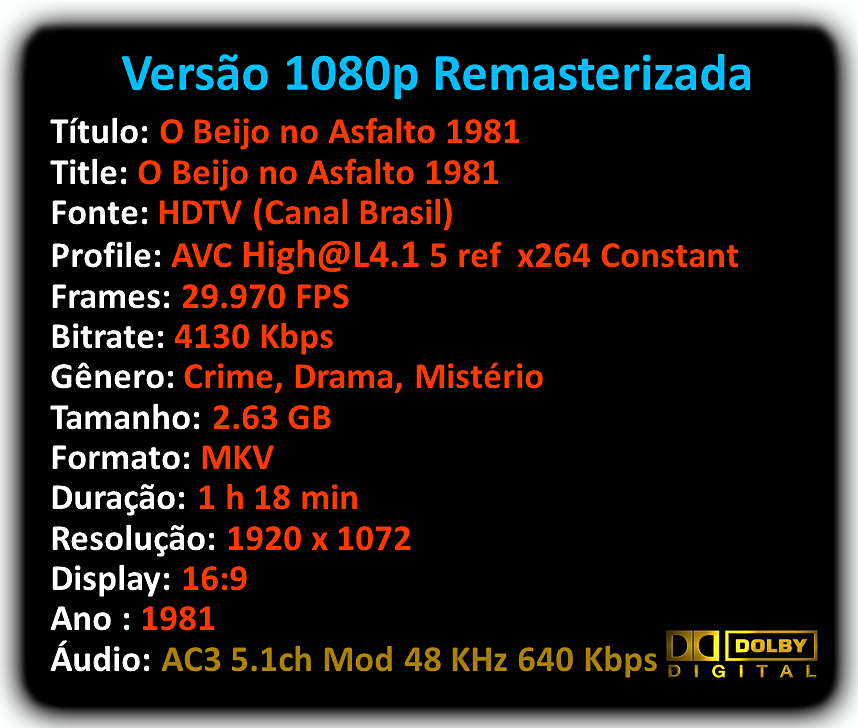 E chagada hora de mais um grande Projeto polemico e aclamado por muitos, trata-se de “O Beijo No Asfalto” pelo qual resolvi também Restaurar e Remasterizar. Efetuei um completo tratamento de imagem, visando algumas correções, aprimoramentos e novas técnicas que incidem na qualidade final e absoluta da Imagem e áudio deste filme. As correções foram cor, contraste, brilho, contraste dinâmico, profundidade de campo e foco fixo. Criei 6 Texturas e 4 Camadas seguindo a base original de cor do filme. A Base de cor padrão foi “YCbCr444” para HDR10bit e SDR8bit. O resultado ficou muito bom e superior a Imagem Original do filme. Já o áudio, efetuei uma edição completa, algumas correções, como retirada de alguns chiados, distorções, volume baixo e abafado, melhorei a qualidade e o resultado final foi um áudio de qualidade melhor. Bom é isso, está finalizado mais um grande Projeto. Vamos a “Descrição Completa do Filme” e já na sequência os “Previews” sobre o Projeto e posteriormente o “Trailer Personalizado”, Descrição do Filme, Links, Lista de Servidores, Críticas, Curiosidades, Screenshots, Premiações, etc.